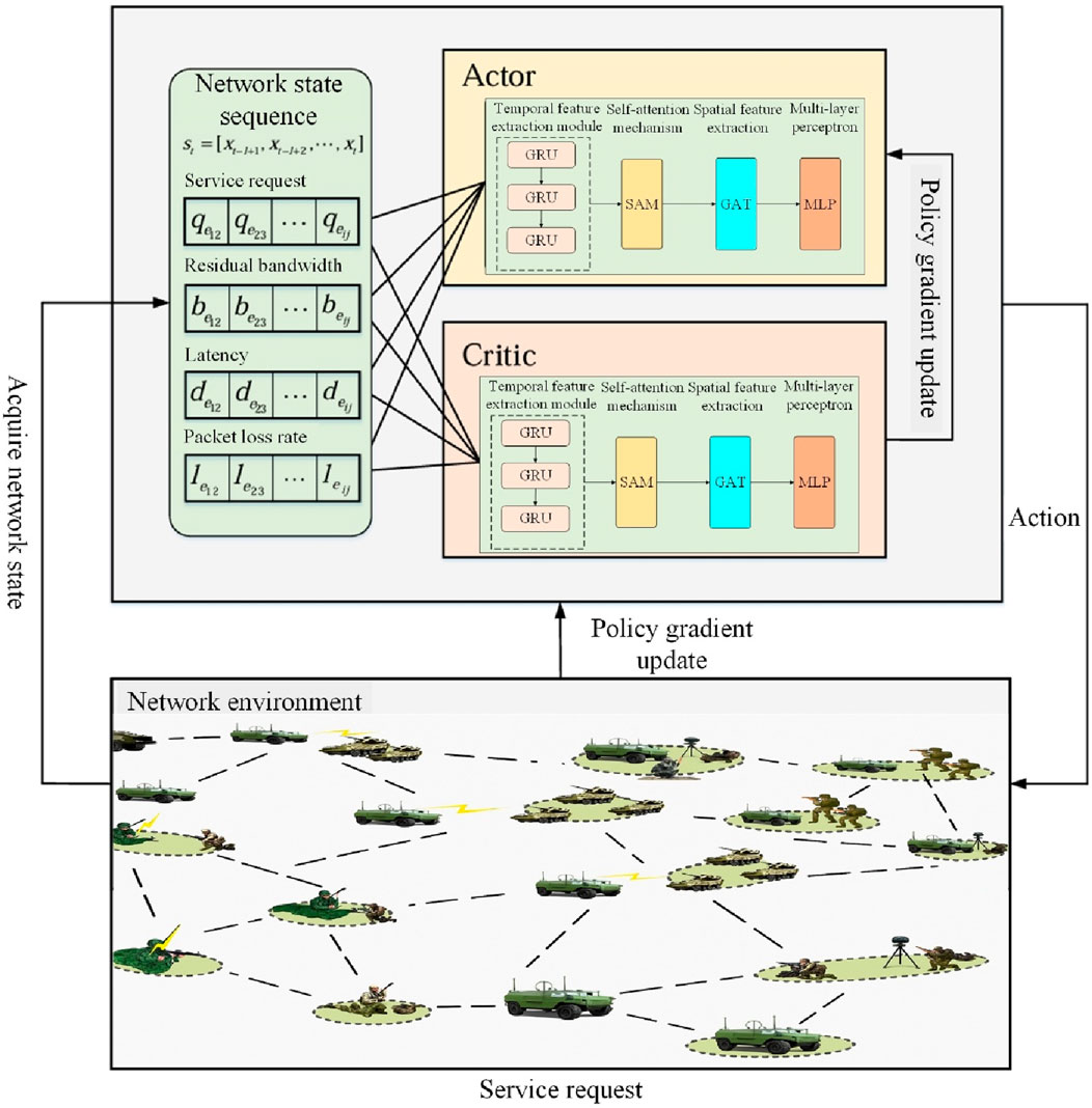 Conventional routing approaches generally compute optimal paths using partial or limited link state information. While effective under stable conditions, these methods adapt poorly to rapid traffic fluctuations and often fail to meet diverse QoS requirements. The explosive growth of data traffic and applications in tactical communication networks further amplifies these limitations, leading to inefficiency and reduced accuracy (Liu et al., 2023). Deep reinforcement learning (DRL), a branch of artificial intelligence, has emerged as a promising solution to these challenges. DRL offers self-learning capabilities without requiring prior environmental knowledge and is well-suited for optimizing high-dimensional state spaces (Wang et al., 2023). Consequently, DRL-based routing strategies have attracted significant attention in path decision-making research.