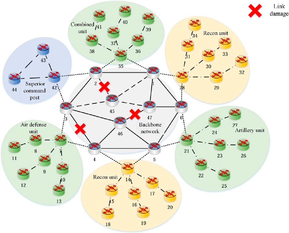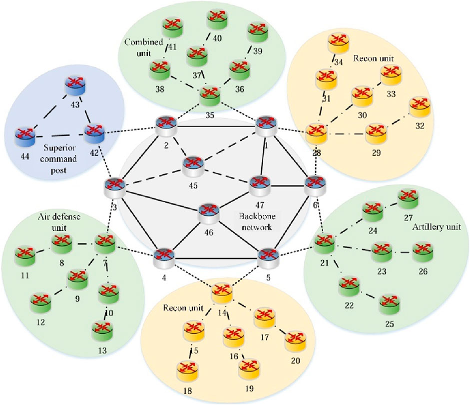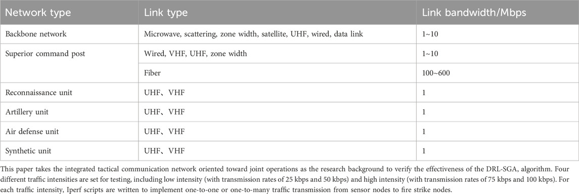 Tactical communication networks designed for intelligent combat must meet several demanding requirements. First, more than five types of heterogeneous services—such as voice, image, and video—are typically transmitted, each with distinct QoS demands concerning delay, bandwidth, and packet-loss tolerance (Pourranjbar et al., 2023). Second, the network infrastructure incorporates more than ten types of heterogeneous links, including shortwave, microwave, and optical fiber, with data rates ranging from Kbps to hundreds of Mbps. These diverse and dynamic link conditions significantly influence network performance and complicate routing decisions. As a result, the design and deployment of routing algorithms face new challenges in highly mobile and adversarial battlefield scenarios (Bajracharya et al., 2023).