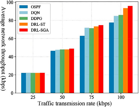 The comparison results in Figure 9 indicate that under low traffic intensity scenarios, the throughput improvement of DRL-SGA over other algorithms is not significant. This is because the low service traffic intensity and sufficient link bandwidth resources do not lead to noticeable network congestion, resulting in relatively small differences in throughput across algorithms. However, as traffic intensity increases, DRL-SGA demonstrates a more pronounced advantage in throughput performance compared to the other algorithms. In high traffic intensity scenarios, DRL-SGA consistently maintains a relatively high level of network throughput. When the traffic intensity reaches 100 kbps, the throughput improves by up to 23.48% compared with the OSPF algorithm, and by up to 2.59% compared with the better-performing DRL-ST algorithm. This indicates that DRL-SGA can formulate more optimal routing strategies based on network load conditions and dynamic link state variations.
