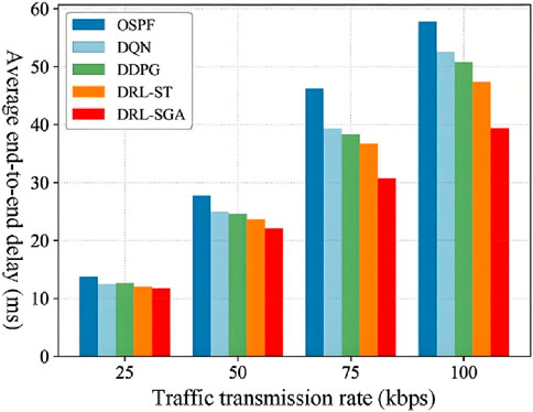 As shown in Figure 10, DRL-SGA achieves lower average end-to-end delay than the comparison routing algorithms under all traffic intensity levels. Moreover, as the traffic intensity increases, DRL-SGA demonstrates more outstanding performance in guaranteeing end-to-end latency. Compared with the traditional OSPF algorithm, DRL-SGA reduces the average end-to-end delay by at least 14.42%, with a maximum reduction of 33.57%. Compared with the DQN algorithm, the delay is reduced by a minimum of 5.69% and up to 25.04%. When compared with the DDPG algorithm, the reduction ranges from 7.08% to 22.44%. Even compared to the better-performing DRL-ST algorithm, DRL-SGA achieves a delay reduction of at least 2.07% and up to 16.88%.