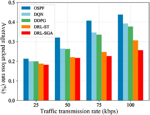 The comparison results in Figure 11 show that DRL-SGA consistently achieves a lower average packet loss rate than the comparison routing algorithms across different traffic intensities. Moreover, as traffic intensity increases, DRL-SGA maintains more stable packet loss performance. Compared with the traditional OSPF algorithm, the average packet loss rate of DRL-SGA is reduced by at least 14.66%. When compared with intelligent algorithms DQN, DDPG, and DRL-ST, the average packet loss rate is reduced by at least 9.03%, 8.73%, and 1.65%, respectively.