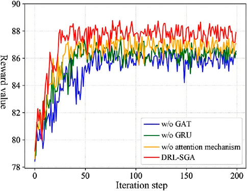 To evaluate the effectiveness of individual components in the link-state feature extraction module for enhancing the perceptual capability of the DRL-SGA algorithm, an ablation study was conducted under the scenario where three links were broken and traffic intensity was set to 100 kbps. The attention mechanism, the temporal feature extraction module (GRU), and the spatial feature extraction module (GAT) were removed individually. The performance of each ablated algorithm was compared with that of the full DRL-SGA model by analyzing the convergence behavior of their reward functions. The comparative results are illustrated in Figure 12.