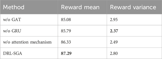 The results indicate that, while the variance in rewards remains comparable across configurations, the full DRL-SGA algorithm achieved mean rewards that are 2.60%, 1.75%, and 1.11% higher than those of the models without GAT, GRU, and the attention mechanism, respectively. This demonstrates that each component in the link-state feature extraction module contributes positively to enhancing the perceptual ability of the agent, enabling the algorithm to adapt to dynamic structural changes in the network and thereby facilitating the output of an optimal routing policy.