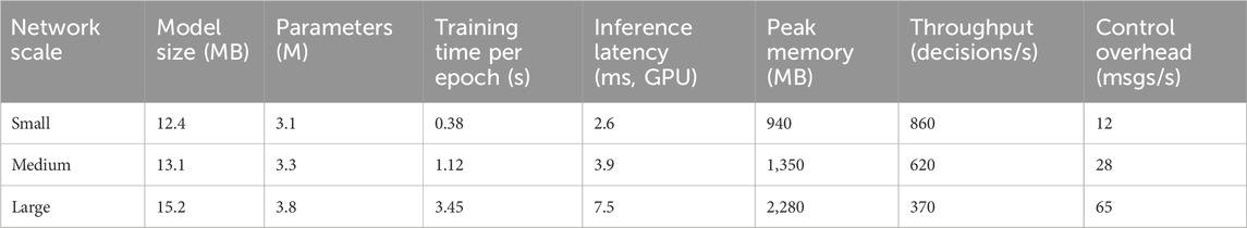 To further assess the feasibility of the proposed DRL-SGA algorithm in practical applications, its computational overhead and scalability were analyzed. Evaluation metrics included model size, parameter count, per-epoch training time, inference latency, peak memory usage, throughput, and control overhead. The experimental environment was identical to that described earlier, and synthetic networks of different scales were constructed to simulate various deployment scenarios: small scale (16 nodes, 24 links), medium scale (47 nodes, 61 links), and large scale (100 nodes, 220 links). The results are presented in Table 5.