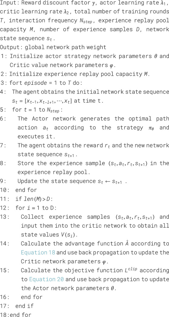 The intelligent optimization algorithm proposed in this paper uses PPO to construct a deep reinforcement learning agent for model training. PPO is more versatile and stable than DDPG, actor-critic and other algorithms (Li and Wu, 2025). The PPO algorithm is implemented based on the AC network architecture. The policy network Actor is used to learn the mean of the network environment state output action, and the evaluation network Critic is used to output the state value. The agent interacts with the environment through state, action and reward information, and continuously optimizes the strategy through iterative training.
