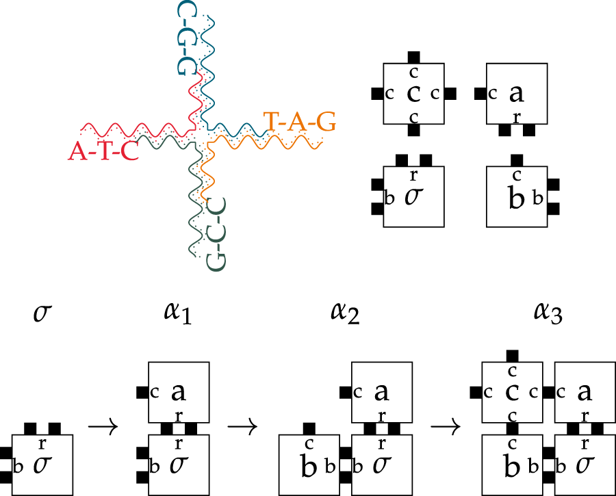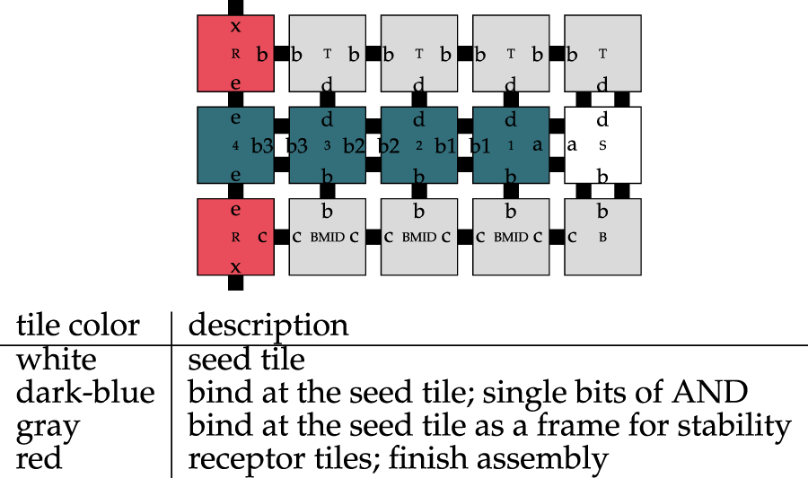 Tile assembly systems are able to perform arbitrary computations and are Turing-complete (Winfree et al., 1998). Further, the tiles themselves are small molecules that can also be used in molecular communication or even as a construction material for nanostructures. It is even possible to form fully functional DNN out of nothing but DNA, as displayed in Figure 2 (Lau et al., 2019). The system works as follows: