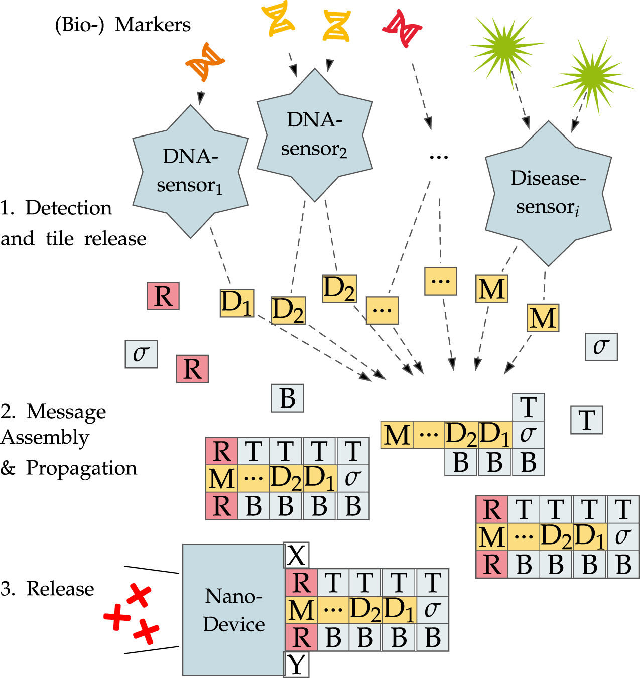 DNN work based on the conditional presence of tiles. Certain nanosensors based on DNA cages, polymersomes, or liposomes can be designed to release tiles or other payload once an environmental condition is fulfilled or a biomarker/DNA sequence is present. Once released, those tiles may interact with other, already present tiles or assemblies to form message molecules that compute a decision problem while growing. Only when all necessary tiles are present may a receptor form that can in turn be detected by other nanodevices. In the case shown in the figure, a simple -bit And is computed on the inputs resulting in checking for multiple conditions that have to be true at once. Once detected, the DNN may react to the findings by either reporting them via a fluorescence reaction to make them visible to the outside or directly releasing some other substance.