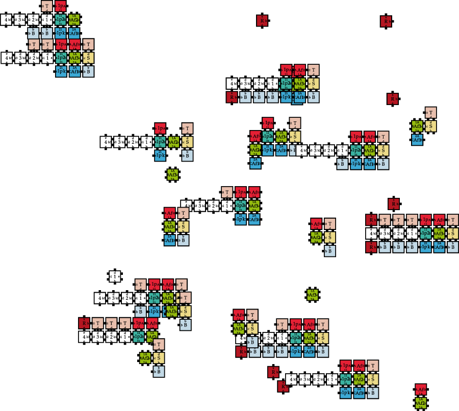 An example of the state of a kTHAM instance can be seen in Figure 4. Multiple tiles and assemblies coexist and may influence each other, resulting in a large space of possible structures. For engineering/networking purposes, a fixed number of tiles is more beneficial than the assumption of infinitely many.