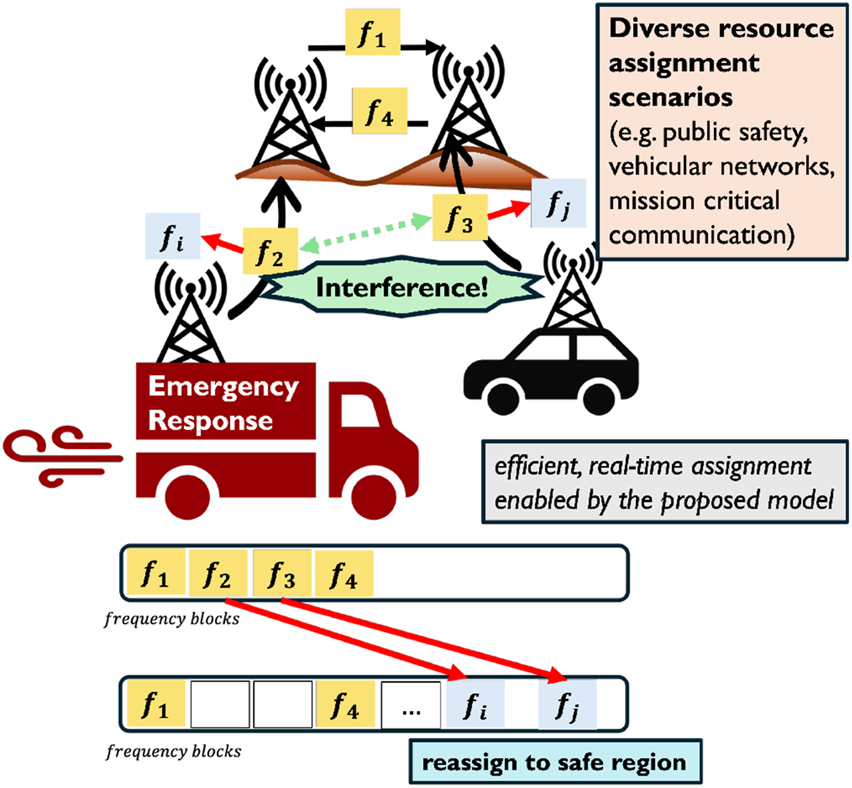 Illustration of the proposed frequency assignment framework applied to a real-world, mission-critical scenario. The top panel shows interference caused by spectrum congestion in a dynamic environment. To prevent communication failure, frequencies and are reassigned to safer bands and , respectively. The proposed model enables real-time reassignment to safer frequency regions while maintaining efficient spectrum utilization.
