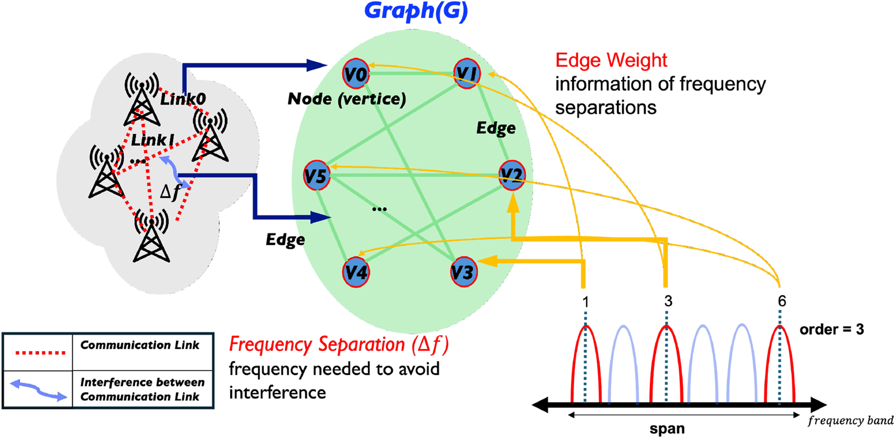 Illustration of a frequency assignment map. A wireless communication system is transformed into a graph , where each node represents a communication link and each edge weight denotes the required frequency separation between interfering links. The objective is to assign frequencies that satisfy these constraints while minimizing either the number of frequency blocks (MO-FAP) or the total frequency span (MS-FAP). This graph-based formulation visually illustrates how frequency assignment problems are modeled and addressed.
