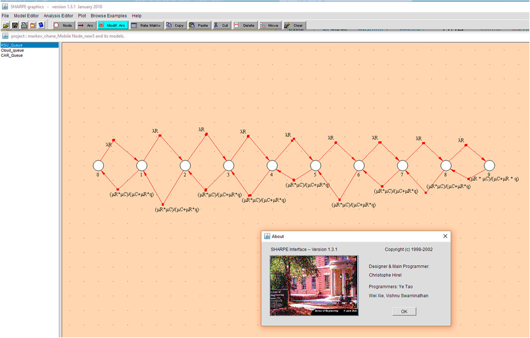 The proposed Markov chain models for the mobile node queue and the RSU queue are not linear by default, and to work with our desired software (SHARPE), all the proposed models, such as the Cloud model, must be presented linearly. Therefore, the models should be slightly edited, with the results presented for the mobile node and the RSU, respectively, as shown in Figures 7, 8.