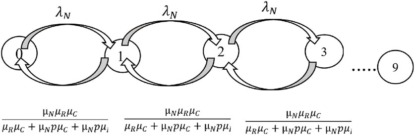In Figure 4, we can see the chain related to the ninety-sir. As can be seen in this image, we indicate the request arrival rate with λN (job/s) and the response rate with WN(job/s). Here, we consider the probability of local processing as 1-P and the probability of sending to the upstream node, i.e., RSU, as p. The maximum number of requests in the queue can be 10. Requests are sent to the processing nodes with a Poisson distribution and at a rate of λN. Because our Markov chain model is CTMC, therefore we do not have loops. Finally, taking into account these possibilities and the required calculations, we reach a final relationship, with the help of this relationship, we calculate the return rate from the State, or in other words, the average response time (WN) for mobile nodes. You can see the details of the calculations are presented in Equation 1.