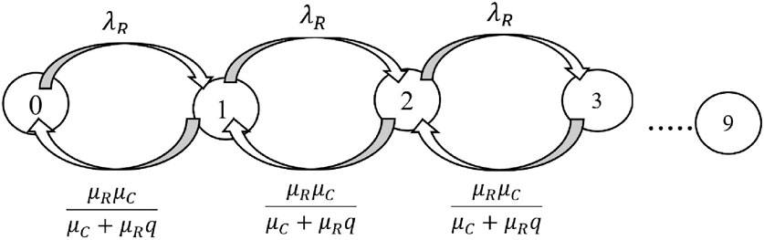 In Figure 5, the Markov chain related to RSU nodes or roadside fixed units is shown. As seen in this image, we denoted the request arrival rate by λR (job/s) and the response rate by. Here, we considered the probability of local processing as 1-q and the probability of sending to the Cloud as q. Finally, considering these possibilities and required calculations, we arrive at a final relationship, with the help of this relationship, we calculate the return rate from the state (State) or in other words, the average response time (