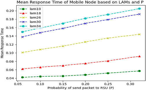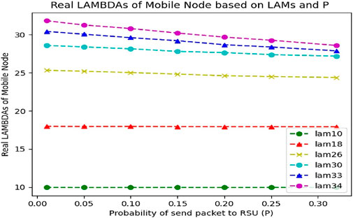As can be seen in Figure 10, when the network input or Lambda and the probability of sending to RSU increase simultaneously, as expected, in low Lambda, there is no significant effect on the number of jobs in the mobile node queue, but in high Lambda, the number The packets in the queue will increase with a relatively higher slope, and if this process continues, knowing that our queue is limited to K, the possibility of discarding the requests will increase, and practically, our network will not be very efficient.