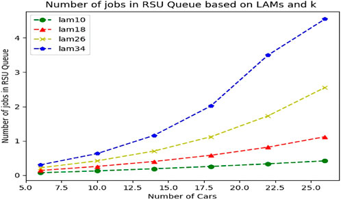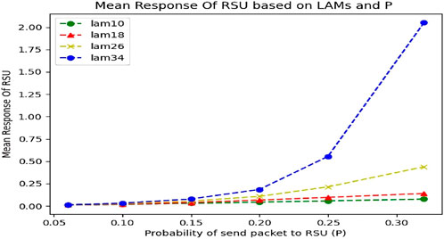 As can be seen in Figure 14, as expected, the state of the queue increases exponentially in proportion to the increase in Lambda, which indicates that the increase in Lambda along with the high variable p (probability of sending to RSU) leads to an increase in the length of the RSU queue.