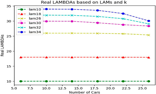 The increasing trend of the queue against the changes of k is quite evident in the large Lambdas. Of course, this increase process will not last long due to the limited queue, and if we continue the current process under the condition of not violating the condition ρ < 1, we will see that the queue growth process will continue at a low speed. When the queue is about to fill up, requests are likely to be discarded. This means that our incoming Lambda is not a real Lambda due to the queue limit. Now, if we want to calculate the actual Lambda based on the input Lambda in proportion to the increase in the number of vehicles, we will reach Figure 17.