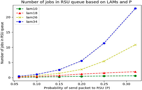 Here, we intend to Investigate the vehicle queue while the variable P, which means the probability of sending to the RSU, changes at the same time as Lambda changes. Increasing this probability means that a large part of the packages cannot be processed by the vehicle due to reasons such as package size or processing resource limitations and are transferred to the RSU. We considered other variables as the values in Table 5 and investigated the worst case.