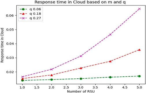 As we can see in Figure 20, as long as the variable q = 0.06 (green curve), the increase in the number of RSUs, which leads to an increase in the input data to the Cloud, does not have much effect on the response time of the Cloud. But with the simultaneous increase of q and RSU (m), the response time of Cloud increases significantly. The point that can be seen is that the response time increase of Cloud is dramatically intensified in larger q. This means that the increase in q and consequently the increase in request input to the Cloud causes the accumulation of JOBs ready to be processed and the formation of a queue based on the defined processing capacity of the Cloud, and after that, we will see an increase in the response time.