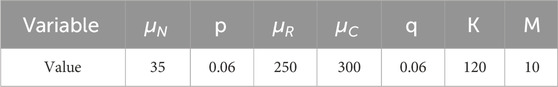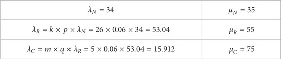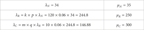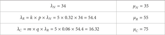 Unless otherwise stated, response times are measured in seconds (s) and rates in s-1. We use Little’s law to calculate the response time. Regardless of the type of structure and modeling, Little’s law examines the response time of the network at each stage. The general equation of Little’s law is as Equation 9. We adopted standard M/M/1/K notation with ρ = λ/μ < 1, blocking probability P_block = ((1−ρ)ρK)/(1−ρ{K+1}), effective arrival λ_eff = λ(1−P_block), mean number in system L, and average response time W = L/λ_eff.
