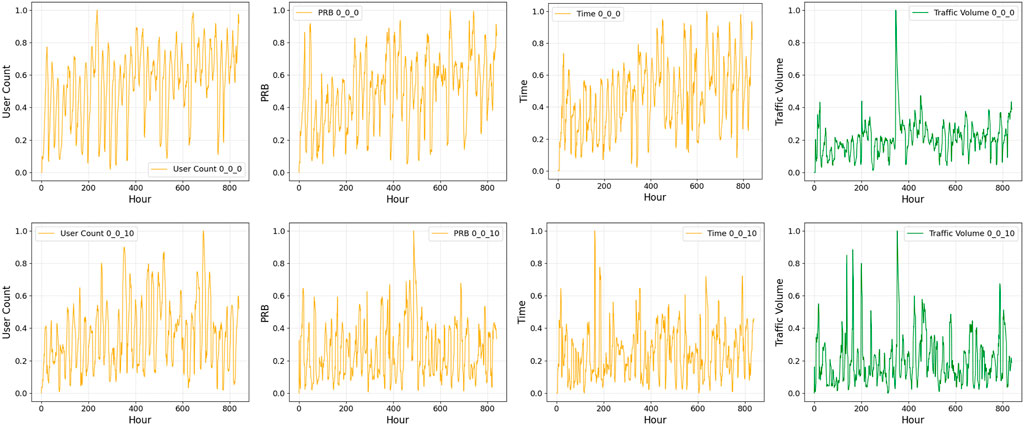 The beam-level spatio-temporal traffic data used in this study was provided by the AI for Good challenge, organized by the International Telecommunication Union (ITU). The dataset comprises four high-resolution telemetry files representing key network metrics: throughput volume (DLThpVol), throughput time (DLThpTime), Physical Resource Block utilization (DLPRB), and user count (MR_number). Each dataset contains 2,419,200 hourly samples spanning 2,880 distinct beams across 30 base stations, recorded over a five-week observation period. This rich dataset captures critical spatio-temporal traffic behavior across an ultra-dense 5G infrastructure.