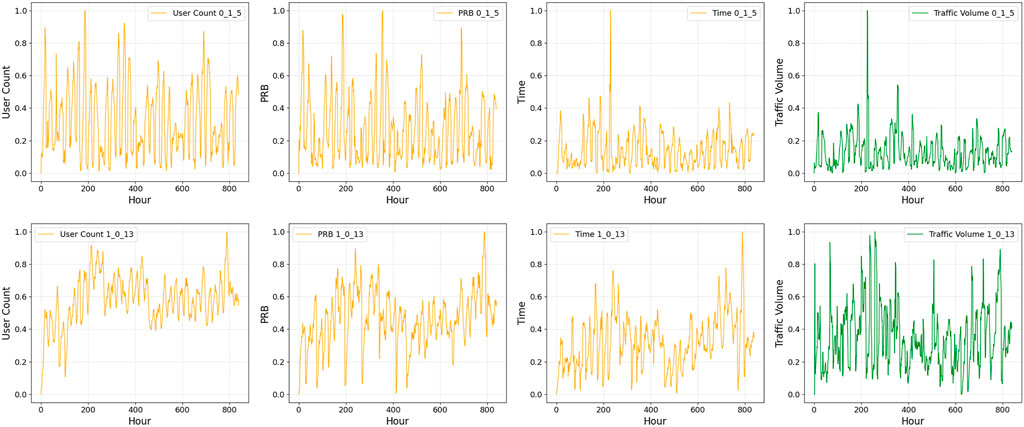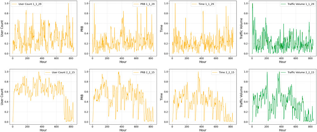 These extensive datasets provides a valuable foundation for exploring forecasting strategies, allowing researchers to develop models capable of capturing intricate spatial and temporal variations in network traffic. Figures 2–4 show examples of the four different time-series data for 5 weeks at different base stations, beams, and cells.