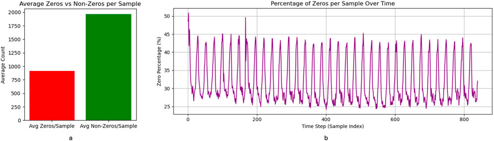Figure 5. Traffic zero and non-zero data distribution. (a) Average Zero vs Non-Zero Counts per Sample. (b) Temporal Distribution of Zero Entries Across Samples.