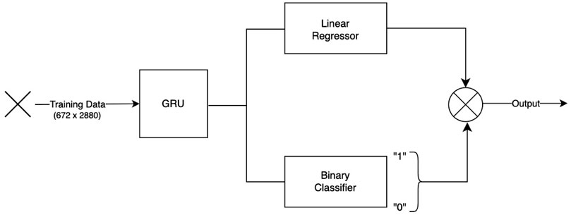 To effectively train our machine learning model while accounting for the challenges posed by intermittent traffic—particularly the prevalence of zero-valued entries due to beam inactivity or sleep modes—we employed a Gated Recurrent Unit (GRU)-based architecture. GRUs are well-suited for time series modeling due to their ability to retain long-range dependencies while mitigating vanishing gradient issues. In this application, the GRU also serves as a preprocessing component that inherently filters noise and highlights salient sequential patterns, improving the model’s ability to generalize beyond sparse signal artifacts.