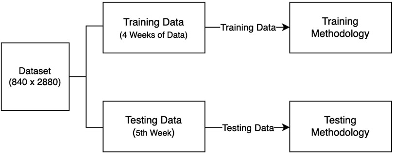 The overall workflow is further summarized in Figures 9, 10, which respectively depict the block-level diagram of the testing pipeline and the training dataset matrix. In Figure 9, the top portion represents the full 4-week training dataset, while the bottom row (crosshatched) represents the fifth week, which serves as the ground truth for evaluating the model’s predictive accuracy. The model’s predictions