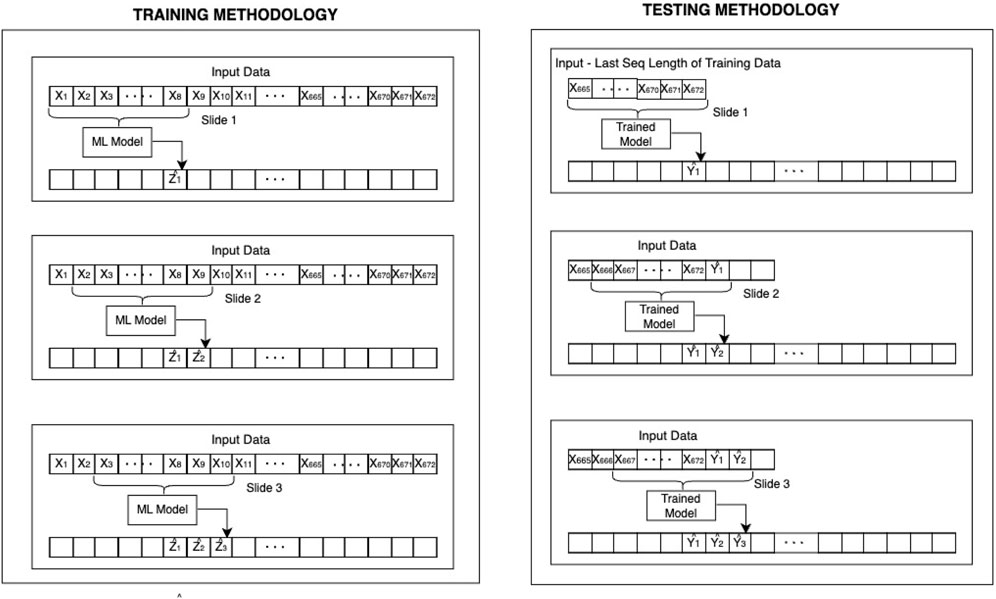 Figure 8. Sliding window strategy used in training and testing. Left: The GRU-based model is trained with incremental target sequences. Right: The pre-trained model recursively predicts future values during testing.