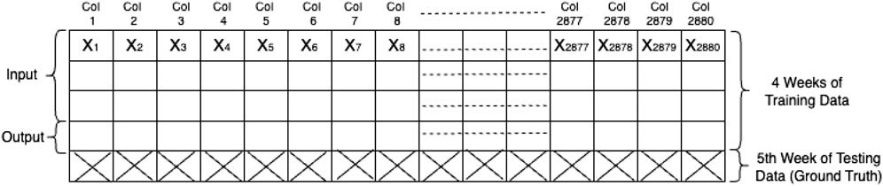 Figure 9. Matrix representation of the 5-week dataset. The first 4 weeks serve as training input; the fifth week serves as testing ground truth for performance evaluation.