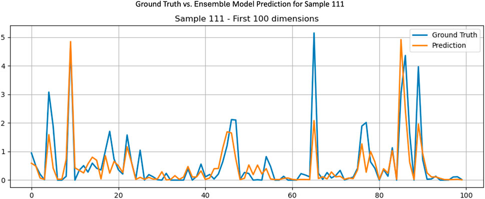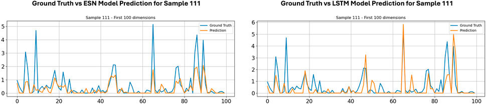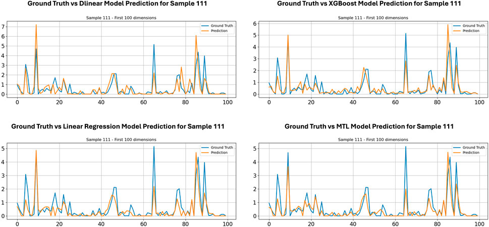 Figures 11, 12 illustrate the beam-level traffic prediction performance of the individual models for a representative test instance (Sample 111). Each plot displays the first 100 dimensions of the traffic volume vector, with the true observed values shown by the blue line and the corresponding predicted values by the orange line. The visual comparison demonstrates how well each model captures the location and magnitude of peaks as well as the sparse inactive intervals.