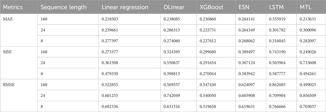 Table 2, presents a comprehensive comparative analysis of six distinct GRU-based models for spatio-temporal beam-level traffic prediction: Linear Regression, DLinear, XGBoost, ESN, LSTM, and our proposed GRU-based MTL approach. The GRU-based MTL model demonstrated superior performance among individual models, achieving MAE values of 0.213631 particularly for sequence length of 168, though this value is slightly elevated compared to our baseline reference model as shown in Table 3. Notably, Linear Regression, XGBoost, and MTL emerged as the top-performing individual approaches, prompting their selection for our ensemble implementation. As shown in Table 5, the weighted ensemble of these three models yielded a slight improvement, attaining MAE score of 0.210520 for the 168-h sequence length - representing