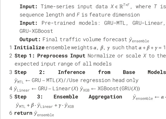 The ensemble, implemented to enhance predictive robustness and capture diverse traffic dynamics, integrates three distinct GRU-based architectures based on their performance: GRU with Multi-task Learning (GRU-MTL), GRU with Linear Regression (GRU-Linear), and GRU with XGBoost (GRU-XGBoost). By aggregating the predictions of these models using weighted averaging, the ensemble aims to reduce variance, mitigate model-specific biases, and improve generalization across varying beam-level traffic conditions in 5G networks. The high-level steps of the ensemble inference process are presented in Algorithm 1.