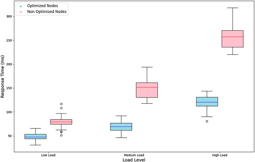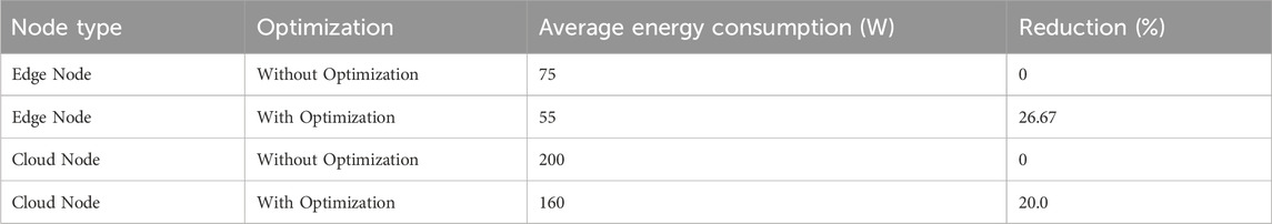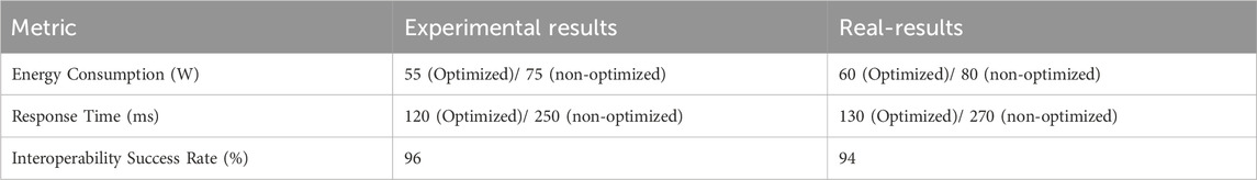In the controlled environment, a predefined set of heterogeneous IoT devices was used to simulate high-load and protocol-diverse conditions. Optimization mechanisms were applied to specific nodes to assess their impact on energy and latency metrics. As shown in Table 5, optimized edge nodes achieved an average energy consumption of 55 W, while non-optimized nodes reached 75 W, resulting in a reduction of 26.7%. In terms of response time, optimized nodes consistently processed requests in 120 ms, compared to 250 ms in non-optimized configurations. Furthermore, the middleware reached a 96% interoperability success rate, indicating robust handling of heterogeneous protocols in this controlled setup.