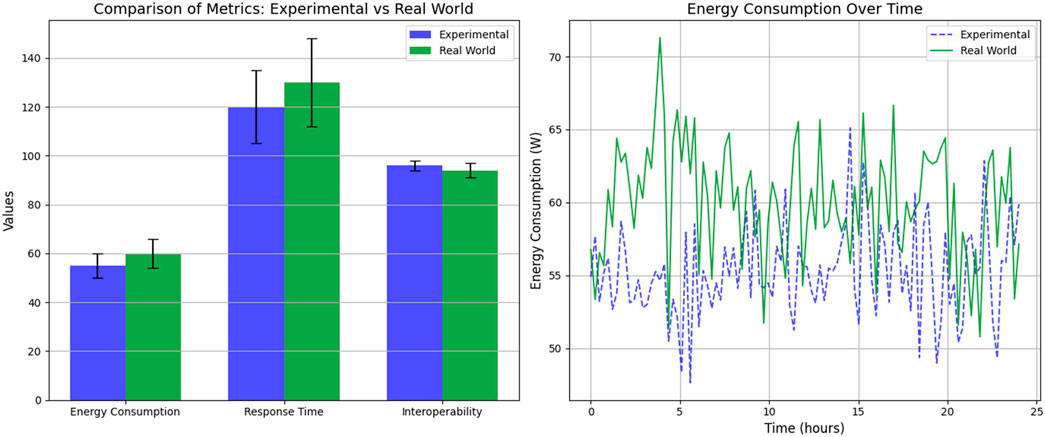 Implementing the middleware in the Smart Campus allowed us to evaluate its performance under actual conditions, where external factors such as dynamic device loading and communication interference influence system behavior. Figure 6 illustrates the results obtained, comparing key metrics between experimental and real environments. In objective tests, the average power consumption increased slightly to 60 W on the optimized nodes and 80 W on the non-optimized nodes due to fluctuations in real workloads. Response times also showed a moderate increase, reaching 130 ms on the optimized nodes and 270 ms on the non-optimized nodes, reflecting the impact of dynamic conditions on the campus network. The interoperability rate remained high at 94%, confirming the middleware’s ability to adapt to a diverse and active IoT environment.