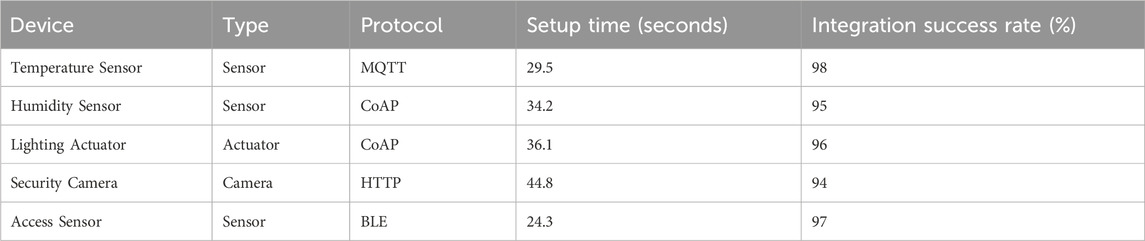 Beyond protocol baselines, our results were also contrasted with recent middleware proposals. Microservice-based orchestration at the fog layer can optimize service composition and elasticity (Emami Khansari and Sharifian, 2024). Yet, it does not target on-the-fly multi-protocol translation at the edge with device onboarding under heterogeneous traffic, which is a core focus of our system (achieving an optimized end-to-end response of 130 ms with validated interoperability). Distributed governance and data-security infrastructures (Tamizshelvan and Vijayalakshmi, 2024) prioritize access control and compliance at scale; our evaluation complements this, emphasizing runtime interoperability and response-time behavior across 120 real devices and up to 500 combined devices. Edge–fog–cloud frameworks in healthcare and smart cities highlight open challenges—interoperability, scalability, energy efficiency, and security (Zaydi and Bakkoury, 2024; Goumopoulos, 2024)—which our deployment addresses empirically through cross-protocol translation and adaptive integration policies on campus. In parallel, automated configuration layers for data backends (Preuveneers et al., 2020) and pluggable security toolkits for constrained devices (Kim et al., 2023) are orthogonal to our contribution. We integrate secure channels and anomaly detection, while our main novelty lies in achieving protocol-level interoperability with measured latency, throughput, and device-integration performance in situ.