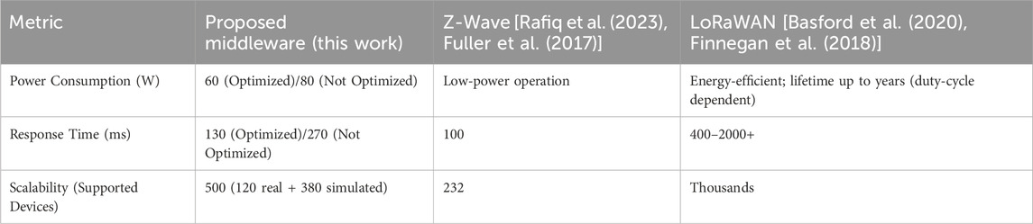 Regarding response times, the middleware achieved 130 ms in optimized conditions, outperforming LoRaWAN deployments that typically exhibit latencies in the order of hundreds of milliseconds to seconds depending on spreading factor and traffic load (Basford et al., 2020), but slightly behind Z-Wave, which maintains low-latency communication around 100 ms in home and building automation scenarios (Rafiq et al., 2023). While Z-Wave provides fast responsiveness, its scalability is constrained to approximately 232 devices per network with a maximum of four hops (Fuller et al., 2017). In contrast, LoRaWAN is designed for large-scale deployments supporting thousands of devices per gateway (Finnegan et al., 2018). The proposed middleware achieves a balanced trade-off between latency, scalability, and interoperability, validated at a scale of 500 devices (120 real and 380 simulated nodes combined) in controlled Smart Campus scenarios.