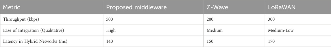 The modular and adaptive architecture of the middleware also enabled a high ease-of-integration score, surpassing the medium scores of Z-Wave and LoRaWAN. This adaptability reduces deployment times and enhances compatibility with heterogeneous devices, a key advantage in agile scaling and fast onboarding scenarios. Latency in hybrid networks was also assessed, with the middleware achieving 140 ms, better than LoRaWAN’s 170 ms and comparable to Z-Wave’s 150 ms. These results are summarized in Table 7.