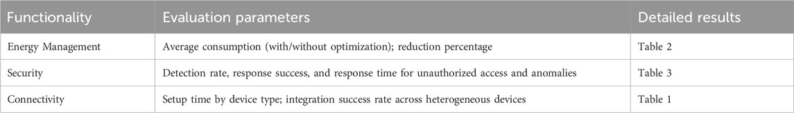 The evaluation covered three key functional areas of the middleware: energy management, security, and connectivity. While the detailed numerical results have been presented in the previous subsections, Table 8 summarizes the validation framework by explicitly listing the evaluation parameters associated with each functionality and referencing the sections where the results are detailed.