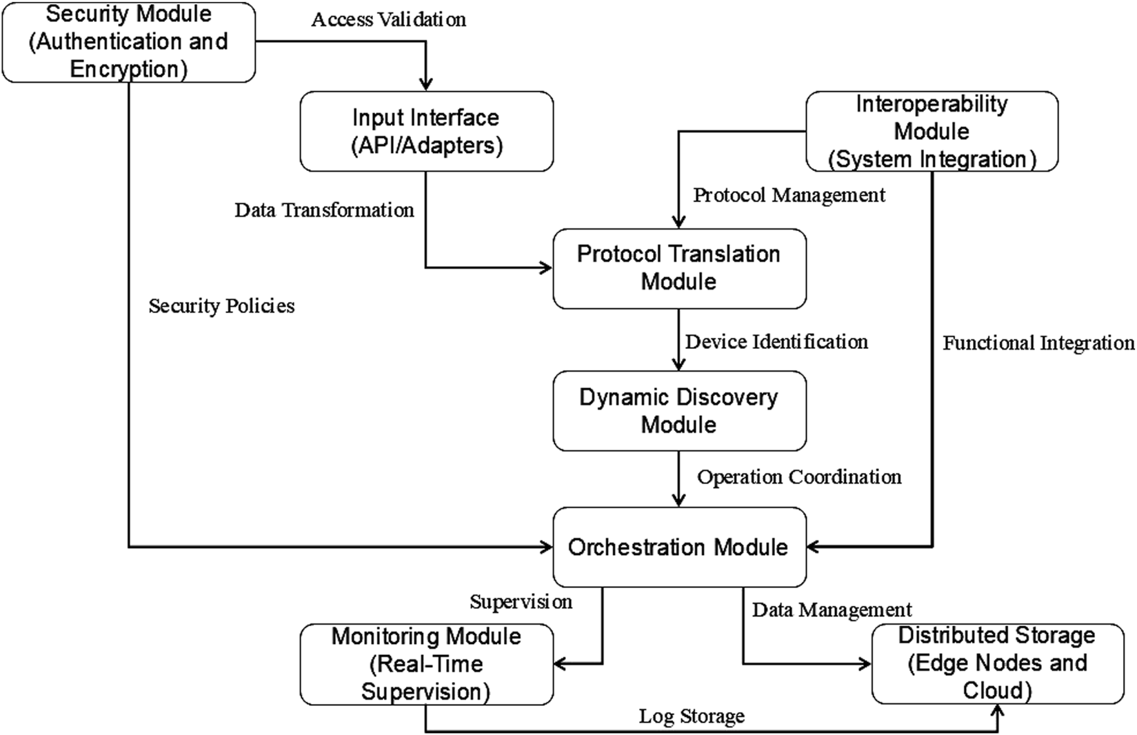 The Orchestration Module coordinates operations between devices and services, ensuring tasks are distributed efficiently. It uses adaptive scheduling policies to prioritize critical tasks and balance workloads across nodes. The module also incorporates resource-aware decision-making algorithms, optimizing energy usage in resource-constrained scenarios.