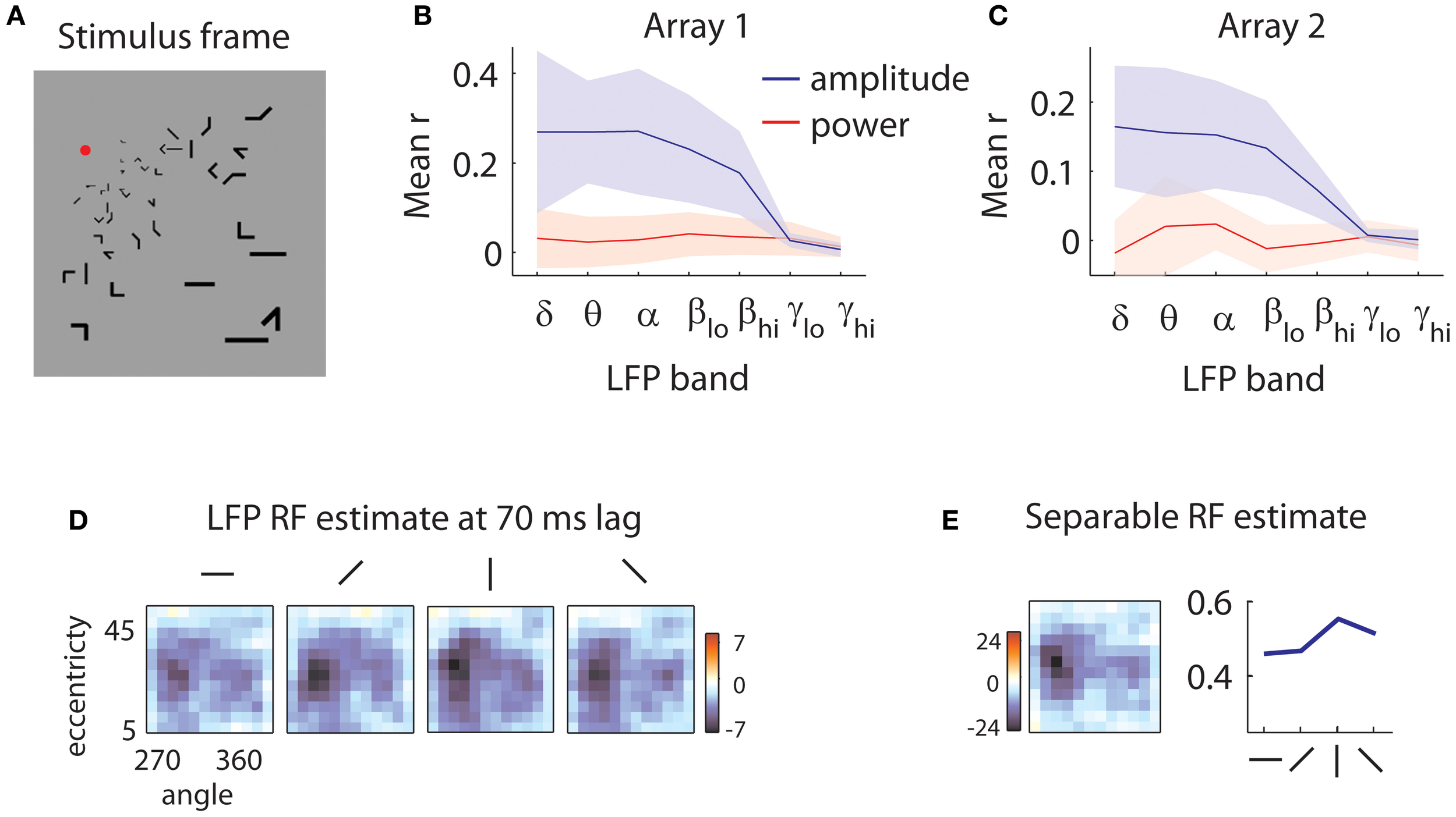 Sample stimulus and receptive field. (A) Sample stimulus frame. The stimulus was composed of sparse bars arranged on a log-polar grid to account for the magnification of the visual field with eccentricity. (B) Quality of reverse correlation fits to the amplitude of the LFPs (blue lines) and power (red lines) in different frequency bands for the first array. Delta: 0.5–4 Hz, theta: 4–8 Hz, alpha: 8–12 Hz, low beta: 12–20 Hz, high beta: 20–30 Hz, low gamma: 30–50 Hz, high gamma: 50–80 Hz. Quality of fit was evaluated by the correlation (r) of the predicted and measured responses in a validation dataset. Shaded error bars represent ±1 s.d. Power is not modulated by the stimulus; rather, the stimulus influences the low-frequency components of the amplitude of the LFPs. (C) Same as in (B), for the second array. (D) Sample LFP RF estimate. The RF of the LFP is measured at a 70 ms time lag relative to stimulus onset. Each square represents the spatial RF for a given orientation. The shape of the spatial RF varies little with orientation. The color bar indicates peak z-values estimated through bootstrapping. Here, as in all subsequent RF illustrations, a Gaussian smoothing kernel with σ = 0.7 is applied. (E) Separable RF estimate. The RF shown in (D) is approximated as separable in space (left) and orientation (right). Little information is lost in the process, and z-values for the spatial envelope of the RF are markedly increased (see legend of color bar).