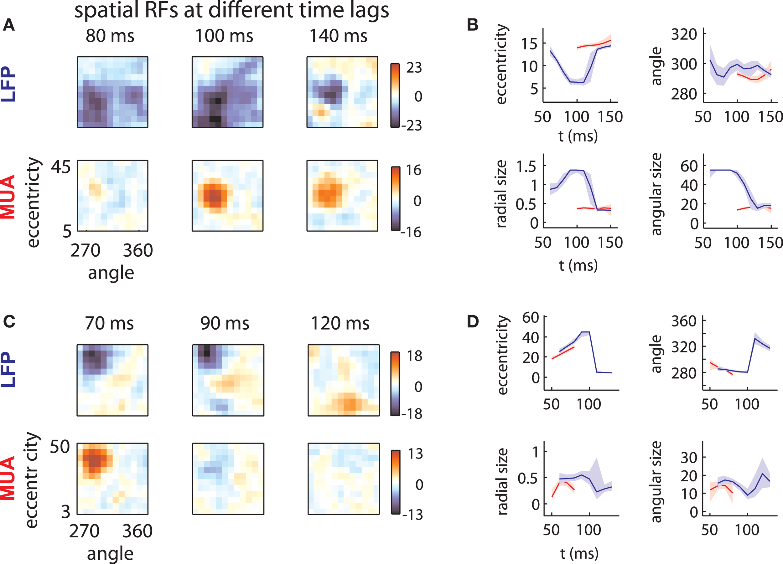 LFP receptive fields change with time lag. (A) Spatial envelope of an LFP RF (top) and MUA RF measured on the same electrode (bottom). The measured spatial envelope of the LFP RF (top) becomes markedly smaller at longer time lags, while the spatial envelope of the MUA RF (bottom) is stable. This pattern was typical for electrodes on the first array. (B) RF position and size as a function of time. LFP RF parameters (blue lines) corresponding to preferred eccentricity, polar angle, radial size, and angular size change markedly as a function of time. MUA RF parameters, illustrated in red, are comparatively stable. Parameters were estimated by fitting a Gaussian to the spatial RFs at different time lags and shaded error bars represent 95% confidence intervals for the parameters estimated through bootstrapping. (C) and (D): as in (A) and (B) for an example electrode on the second array. Here, the LFP RF shows a late, foveal excitatory region (120 ms) far from the initial, peripheral preference (70 ms).