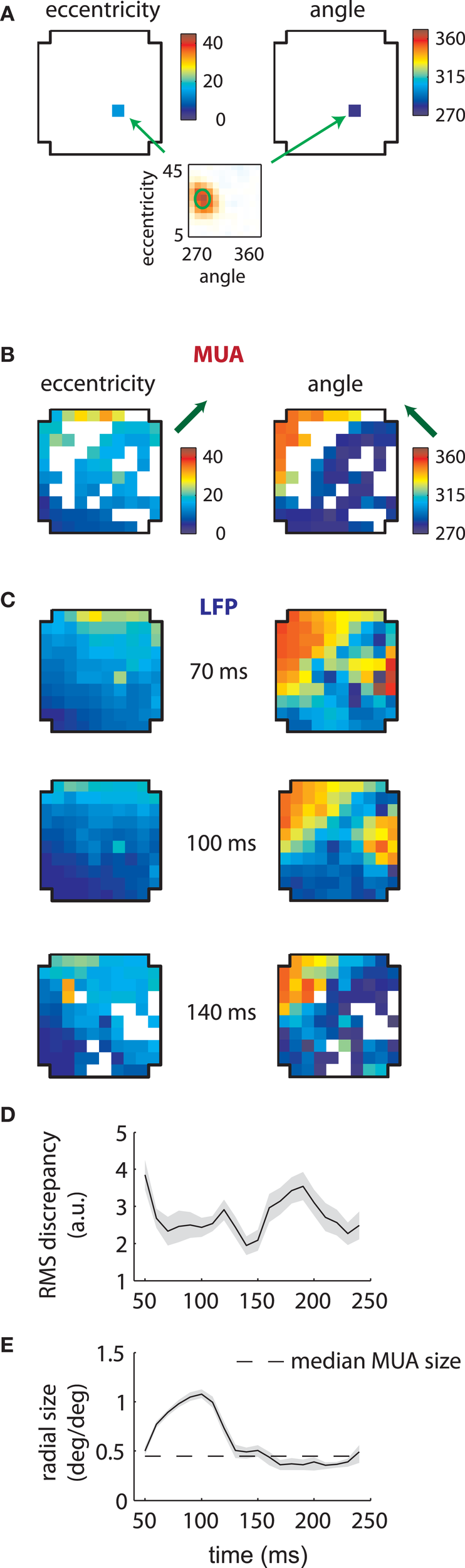 LFP RFs exhibited a similar retinotopic organization, as illustrated in Figure 3C for the same array. As expected from the examples shown in the previous section, LFP retinotopy changed as a function of time lag. These changes were coherent across the array: at later time lags (140 ms), a greater proportion of the array responded to foveal locations (as shown by the increased representation of dark blue colors, left plot) and angles near 270° (again shown in dark blue, right plot). Figure 3D shows that the preferred angle and eccentricity of LFPs best matched those of MUAs at a time lag of 140 ms, as measured by the root-mean-squared (RMS) discrepancy.