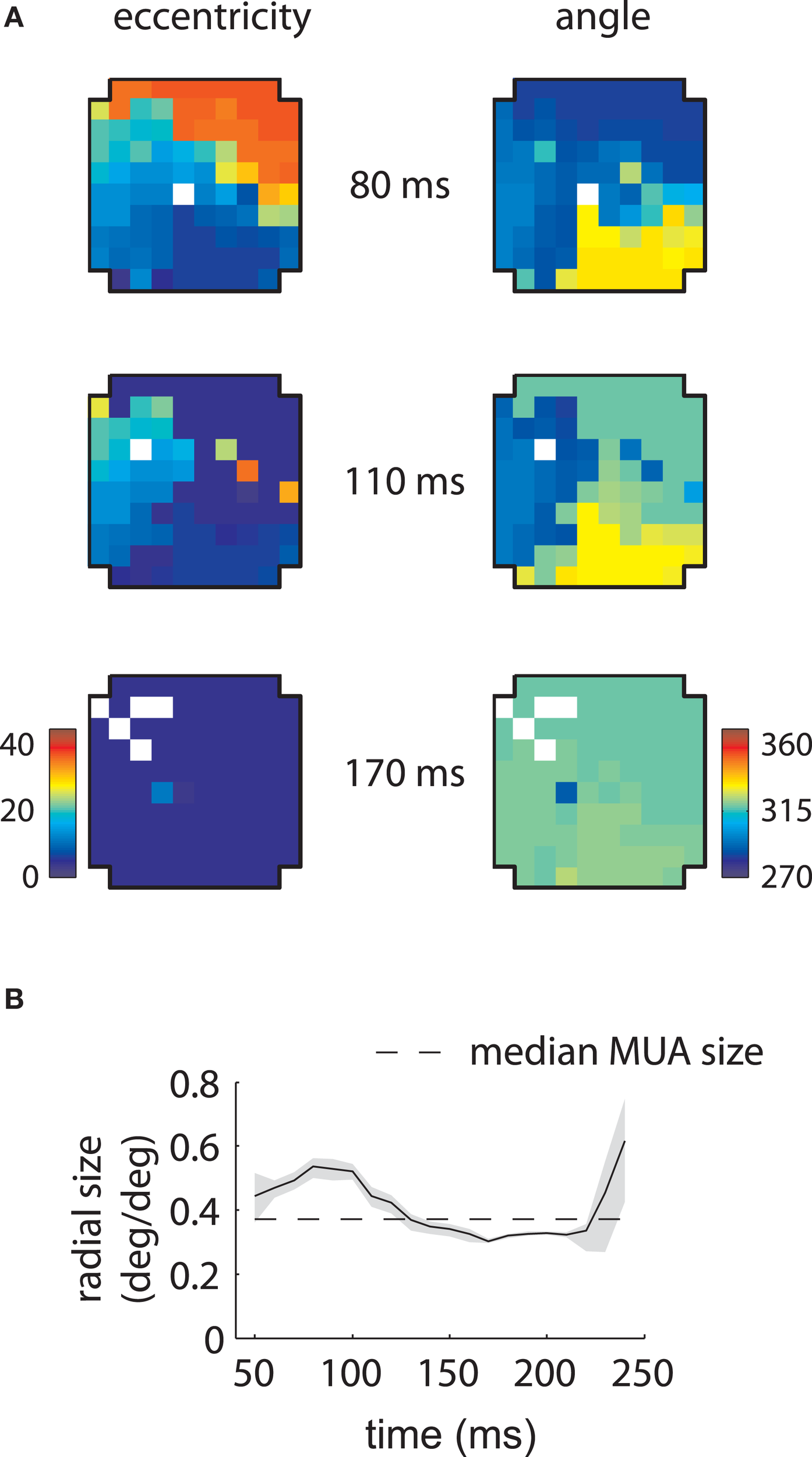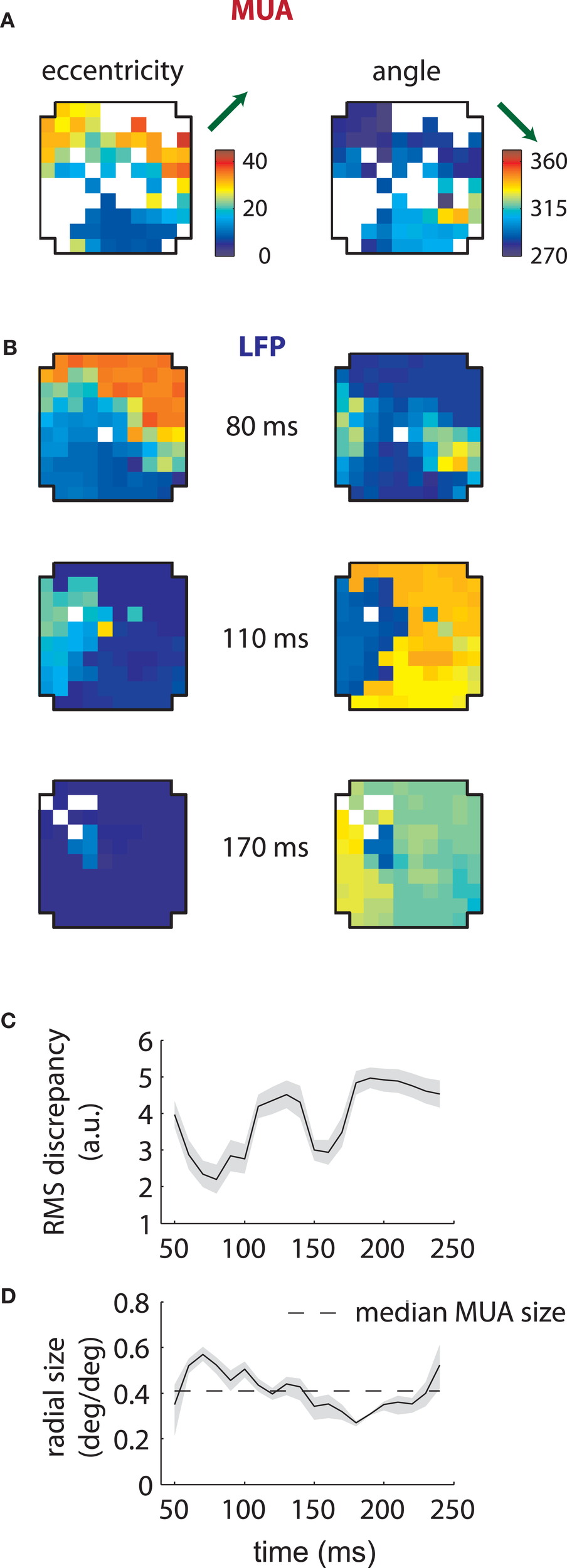 MUA and LFP retinotopy—Array 2. (A–D) as in Figures 3(B–E), now for the second array. The second array shows qualitatively different changes in retinotopy as a function of time. In particular, while at early time lags (80 ms) the array forms a smooth retinotopy, at later time lags (170 ms) the entire array represents a foveal location.