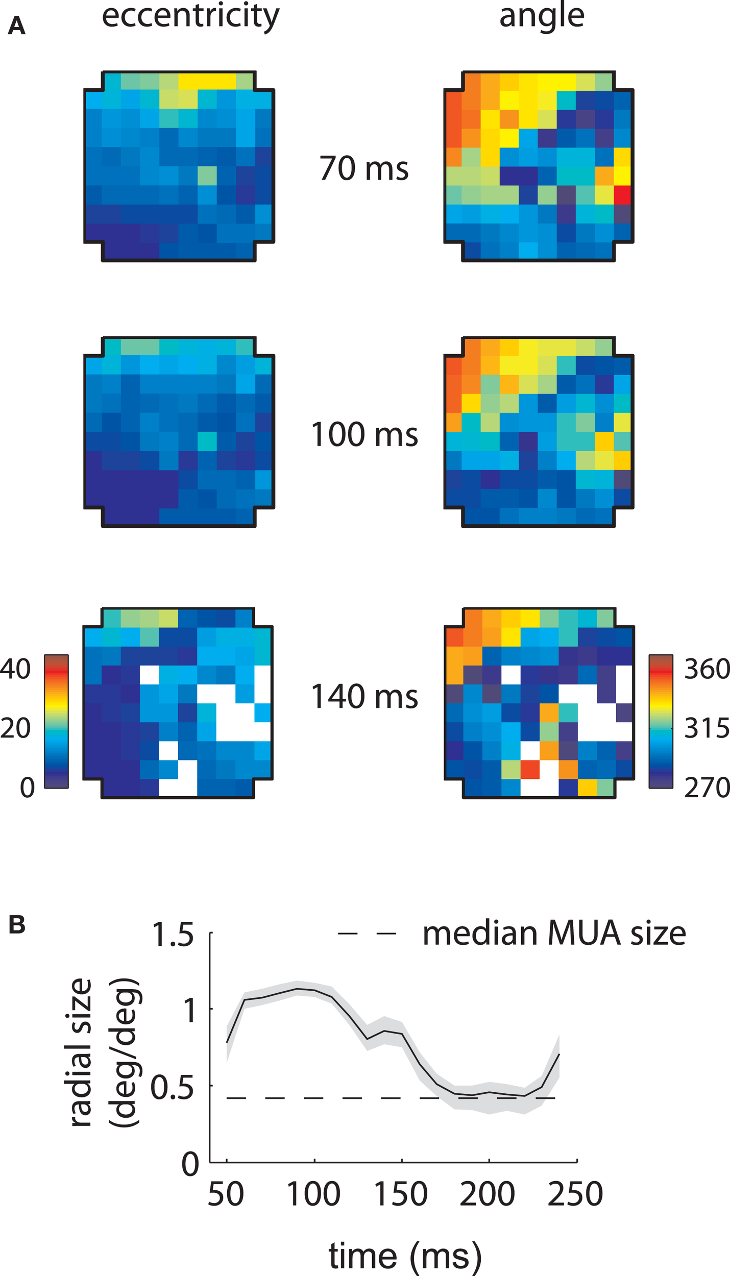 Reconstructed retinotopies based on temporal mixture model—Array 1. (A) Reconstructed retinotopy of the array as a function of time. These retinotopic maps were obtained by fitting the temporal mixture model to the array 1 data, creating simulated RFs based on the measured parameters, and fitting the simulated RFs with Gaussians. The mixture model captures the greater representation of low eccentricity and 270° locations at late time lags (140 ms). (B) Reconstructed mean RF size as a function of time. The model captures the dramatic change in measured RF size as a function of time. Shaded error bars represent 95% confidence intervals for the mean.