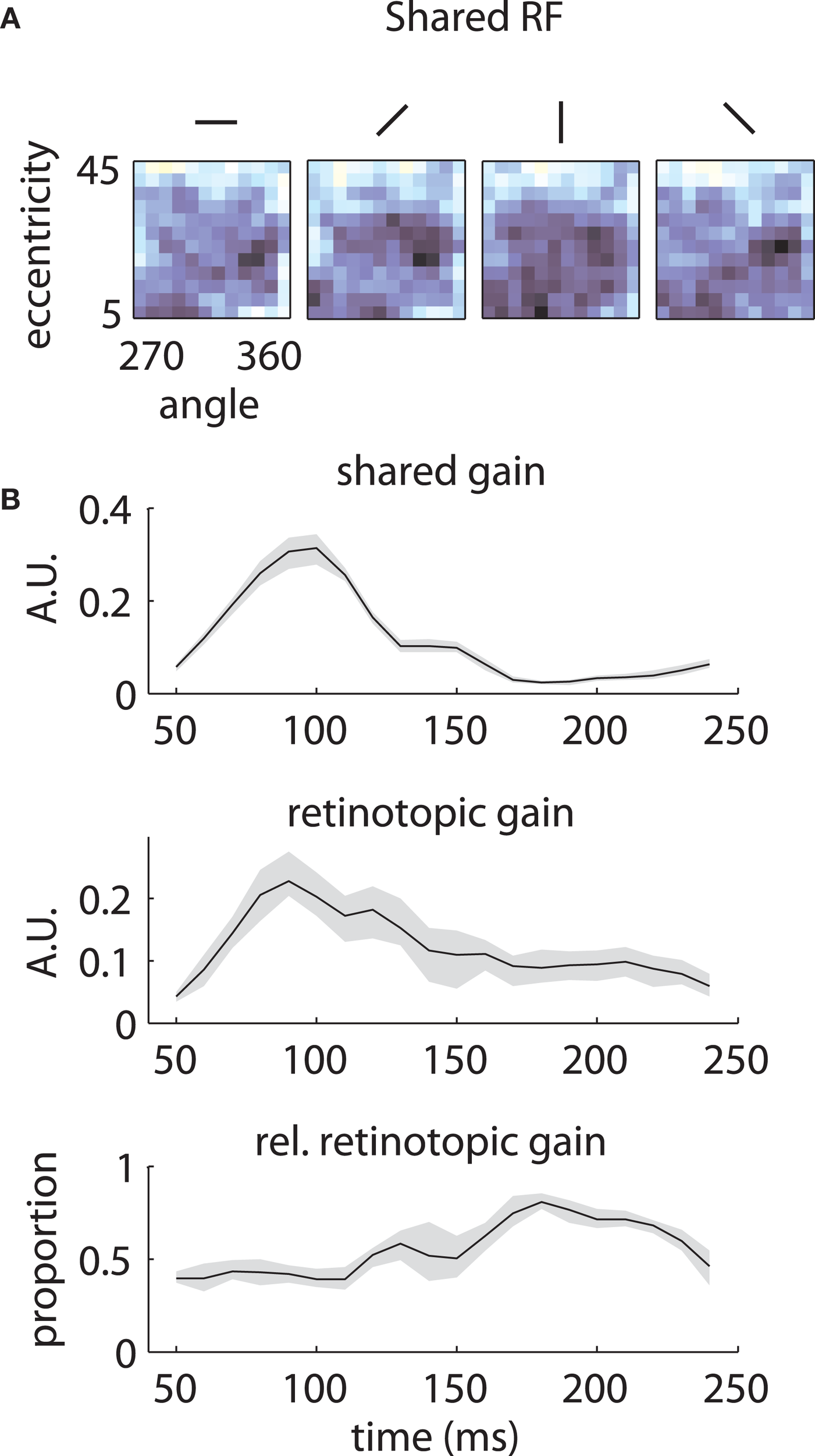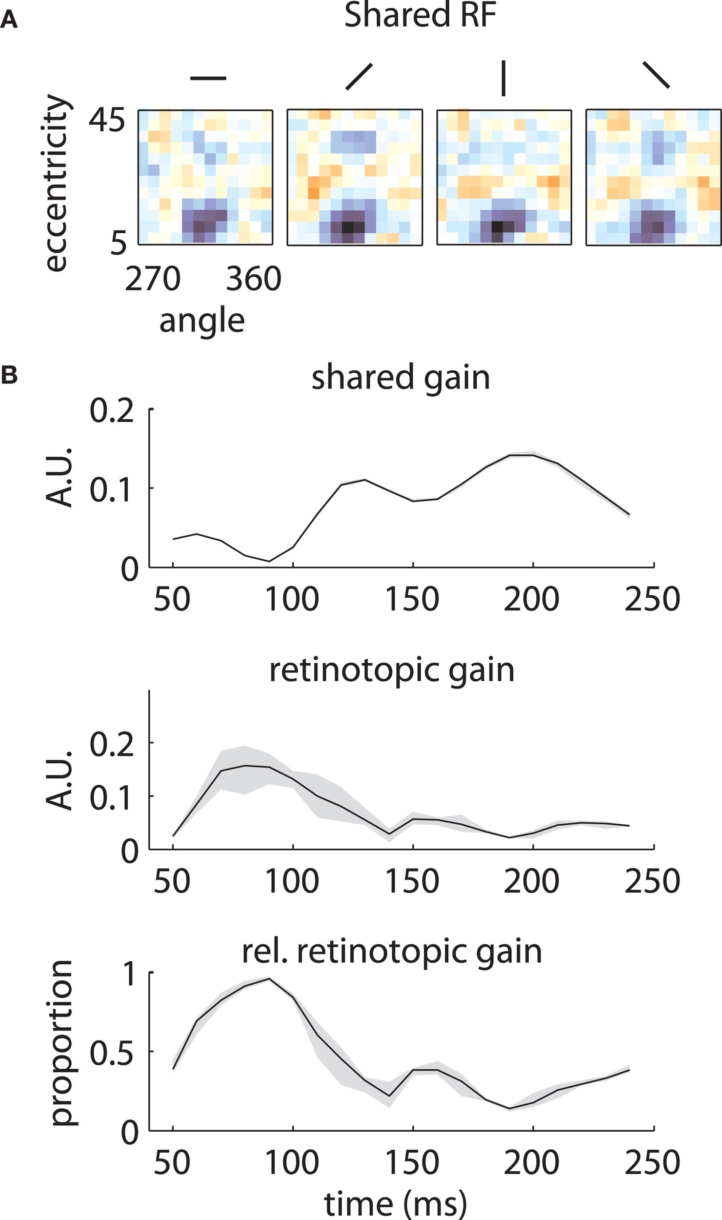 Temporal mixture model parameters—Array 1. (A) Shared receptive field estimated from the data. The RF is broadly tuned for space and orientation. (B) Gains of each component as a function of time. Both the median shared gain (top) and the retinotopic gain (middle) peak at early time lags. However, the retinotopic gain decays more slowly as a function of time. Therefore, the retinotopic gain is relatively larger at late time lags (bottom). This creates a shift in the representation from broadly tuned (shared component) to more tightly tuned (retinotopic component). Shaded error bars represent 95% confidence intervals for the median.