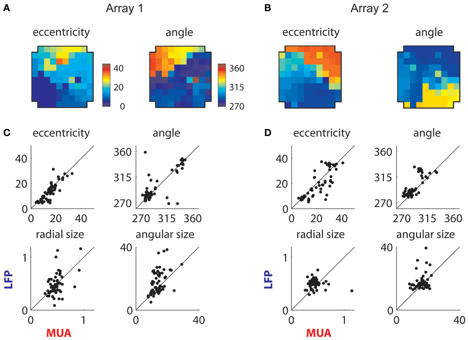 Retinotopic components. (A) Measured retinotopy of retinotopic component for Array 1 and (B) for Array 2. These can be compared to the corresponding MUA-based estimates in Figures 3B and 4A. (C) Receptive field parameters of LFPs and MUAs measured on the same electrode compared for Array 1 and (D) Array 2. Eccentricity and angle match between MUAs and LFPs, while LFPs display larger receptive fields on average.