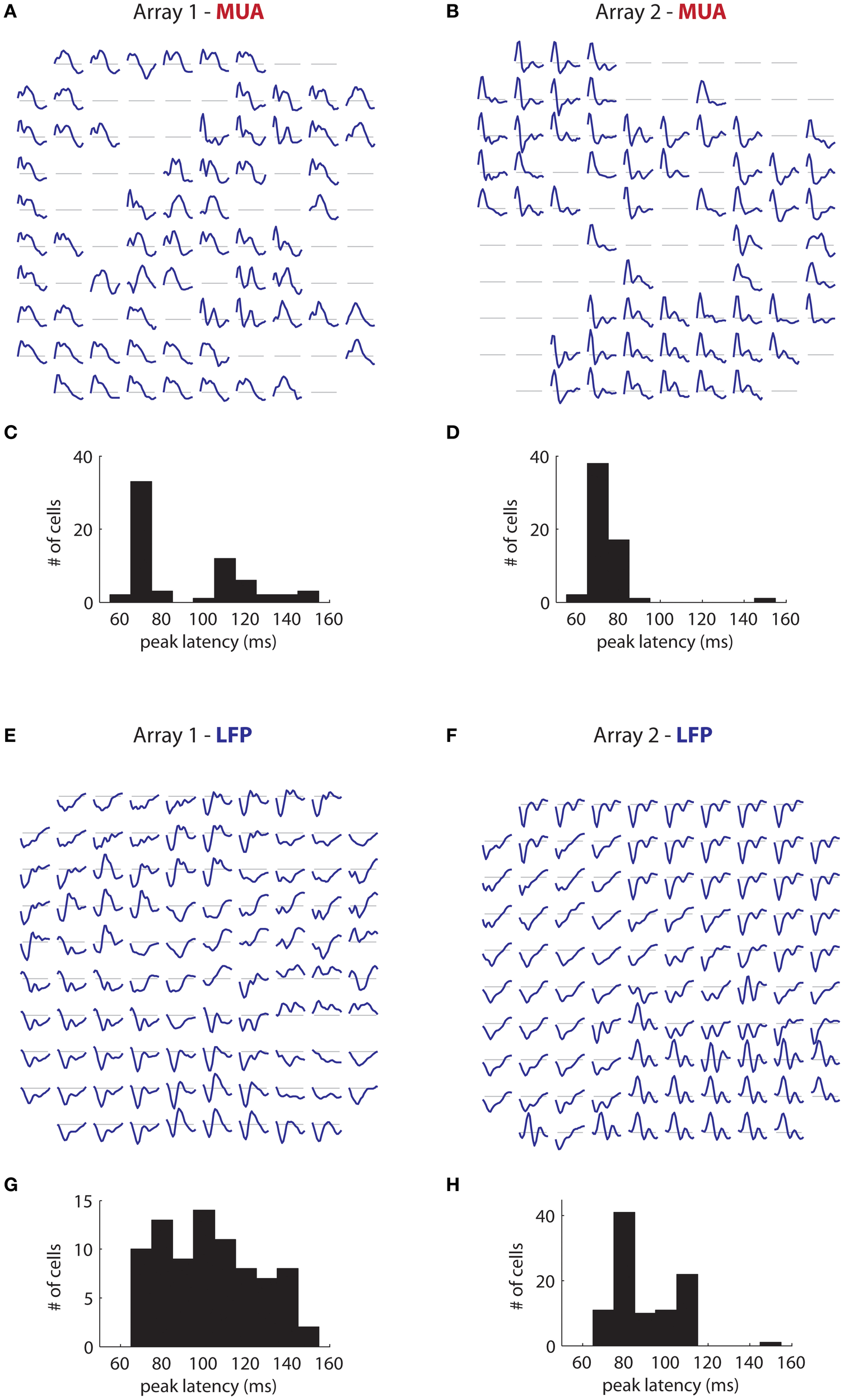 More interesting is the temporal tuning of both signals. Figure 11A illustrates the temporal filters of significantly tuned MUAs (blue lines; 50–240 ms) as a function of their position on the first array. Temporal filters are stereotyped through the array, with a rapid rise followed by a slower decay. There is some indication of suppression at late time lags (segments below the gray line). The majority of filters have a peak latency of 70 ms (Figure 11C), with a minority having a peak around 120 ms. These results are mirrored in array 2 (Figure 11B), where the filters are also highly stereotyped, although here the decay appears faster. The peak latency is also centered around 70 ms (mean: 73 ms; Figure 11D).