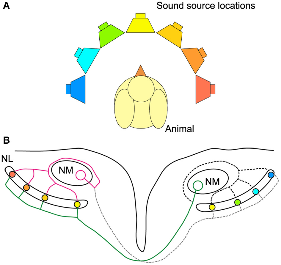 Avian sound localization circuit. (A) Color-coded speakers represent different sound source positions along azimuth. (B) Schematic representation of the sound localization circuit in the chicken auditory brainstem. NL cells are coincidence detectors and respond best to the sound source location with the corresponding color-coding. The ipsilateral axon terminals provide an isochronic input to the dorsal dendrites of NL, while the contralateral input is systematically delayed from medial to lateral. The ipsilateral and contralateral inputs to NL are provided by a single NM axon projecting to both NLs. Note that sound from straight ahead is encoded by neurons near the medial edge of NL and that most of the NL is tuned to sound source locations in the contralateral hemisphere. Magenta: ipsilateral axon branch, green: contralateral axon branch.