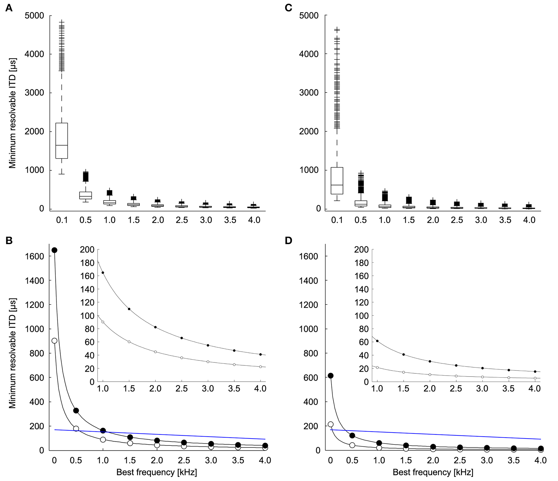 Minimum resolvable ITD. (A) Minimum resolvable ITD as a function of best frequency. Each boxplot shows the distribution of minimum resolvable ITD if the peak is used to discriminate between ITDs over all combinations of the parameters (A,B), and k (n = 1123). The box extends from the first quartile to the third quartile of the sample. Outliers (+) are datapoints that lie >1.5-fold the interquartile range of the sample beyond the box. Lines extend to the maximum and minimum points that are not outliers. (B) The minimum (white) and median (black) of the minimum resolvable ITD at each frequency if the peak is used to discriminate between ITDs. Blue line indicates natural range of ITDs (See Methods and Hyson et al., 1994). The inset shows the minimum and median for frequencies between 1 and 4 kHz. (C) Minimum resolvable ITD as a function of best frequency if the slope is used to discriminate between ITDs (n = 1220). (D) The minimum (white) and median (black) of the minimum resolvable ITD at each frequency if the slope is used to discriminate between ITDs. Blue line indicates natural range of ITDs (See Methods and Hyson et al., 1994). The inset shows the minimum and median for frequencies between 1 and 4 kHz.